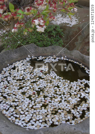 Cherry blossom petals on washbasin / 手水鉢に浮かぶ桜の花びら