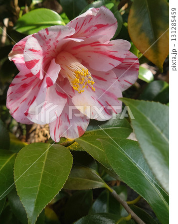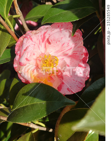 A winter camellia / 満開となった紅白のまだら模様(斑入り模様)の寒椿の花