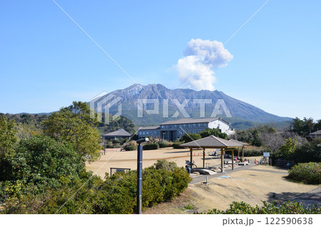 レインボービーチから見た風景・雪冠した桜島