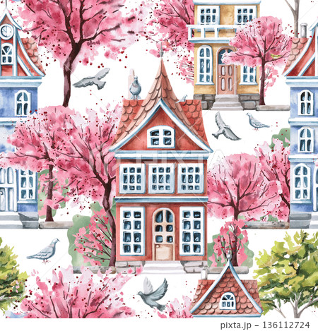 A spring town with colorful houses, blooming trees, and doves in a seamless pattern. Watercolor illustration of a spring town for tourism graphic design, real estate websites, and interior design.