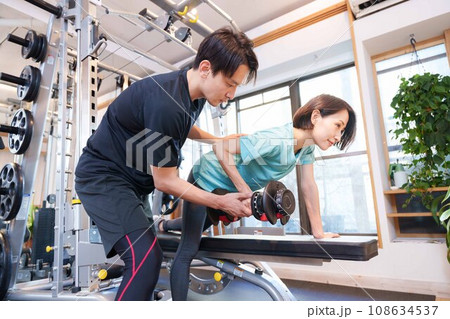 スポーツジムで運動する女性とトレーナー(ダンベル)