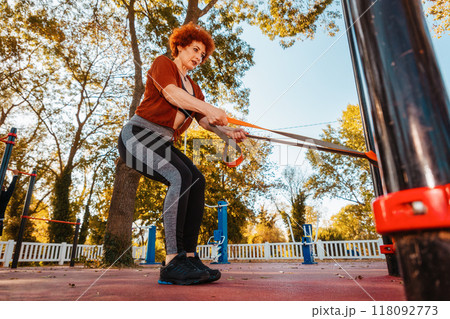 Bottom view of adult strong Caucasian woman does stretching with elastic band on sports playground