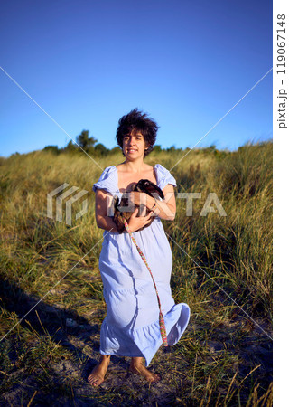young plus size woman walking and playing with her pet rabbit by the sea in Copenhagen