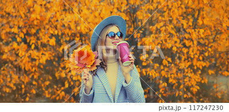 Autumn portrait of beautiful happy smiling woman with yellow maple leaves drink coffee in the park