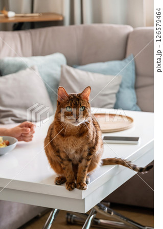 Bengal Cat Sitting on the Table, Curious and Calm in Domestic Setting.