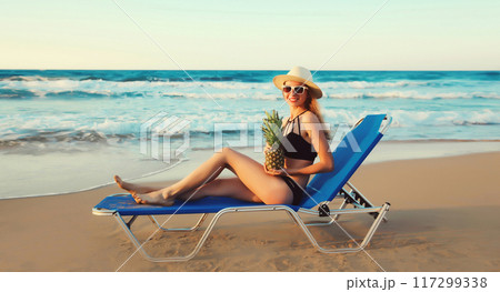 Summer vacation, happy relaxing young woman lying on deckchair with pineapple on the beach on sea
