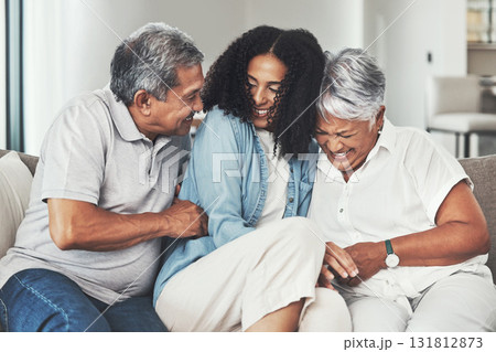 Love, happy family and senior parents with daughter laughing, playing and enjoy funny joke together. Holiday smile, vacation home and fun elderly mother, father and woman relax in house