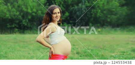 Beautiful happy smiling young pregnant woman looking at camera standing in summer park