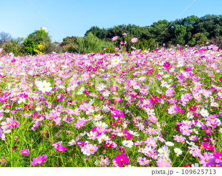 秋晴れの下、花いっぱいの明るく満開のコスモス畑