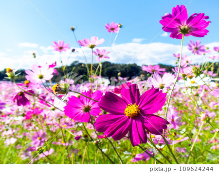 秋晴れの下、花いっぱいの明るく満開のコスモス畑で蜜を吸うミツバチ