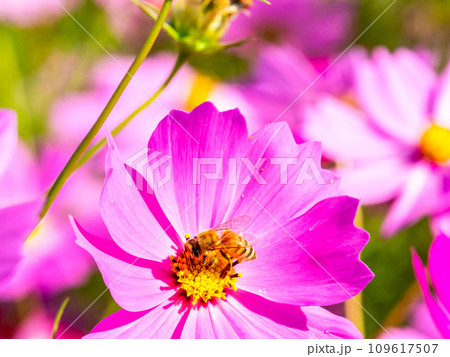 秋の景色 可憐でかわいいカラフルなコスモスの蜜を吸うミツバチ