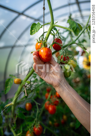 Home grown tomatoes. Arm harvesting vegetables while inspecting plant health in controlled climate.