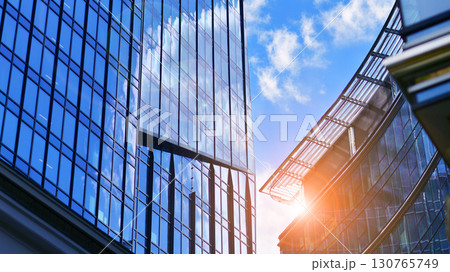 Modern sustainable glass office buildings. Exterior view of corporate headquarters glass buildings architecture.Glass windows in energy-efficient buildings. Financial business center buildings.