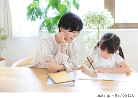 リビングで勉強をする小学生の娘と母親