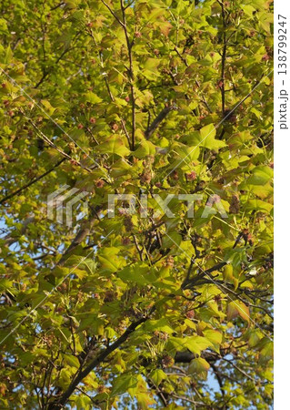 初冬の空と色付いたタイワンフウの葉っぱ(夕方の公園の台湾楓)