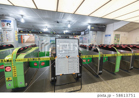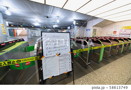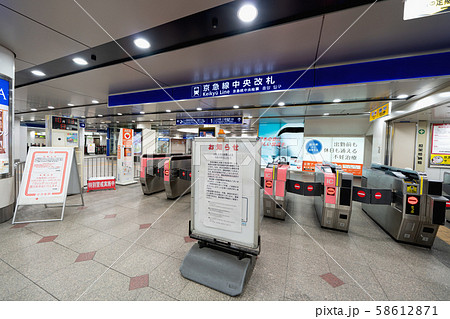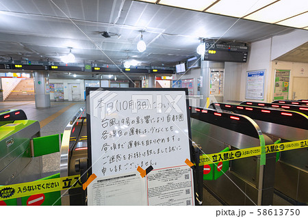 日本の横浜都市景観 京急線中央改札(台風19号の影響で運転見合わせ)=13日午前、横浜駅