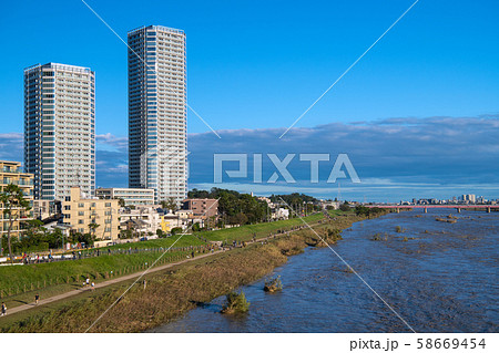 日本の東京都市景観 台風19号一夜明け・増水・泥水の多摩川。多くの見学者であふれた=13日午後