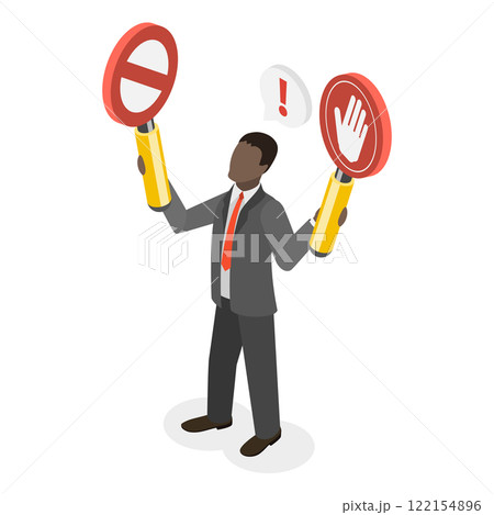 3D Isometric Flat Illustration of Prohibited Or Restriction, Businessman Holding Forbidden and Stop Sign Symbolizing Illegal, Risky and Dangerous Activities