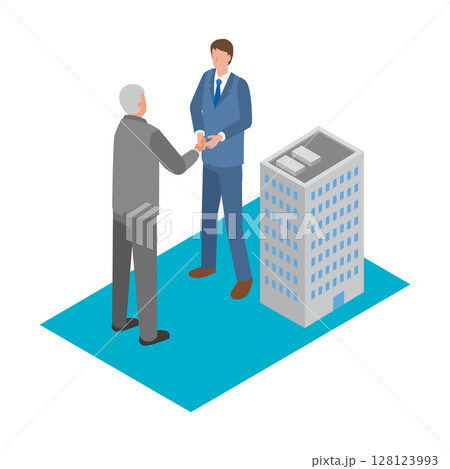 がっちりと握手する企業ビルのキャラクター