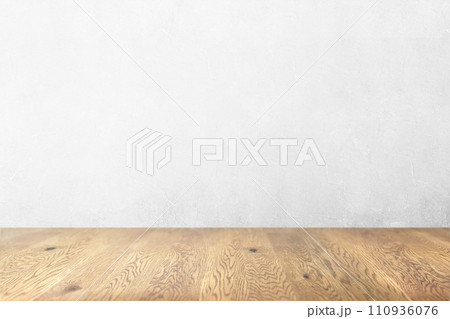 木目のあるナチュラルな木のテーブルと凹凸のある白の壁の背景