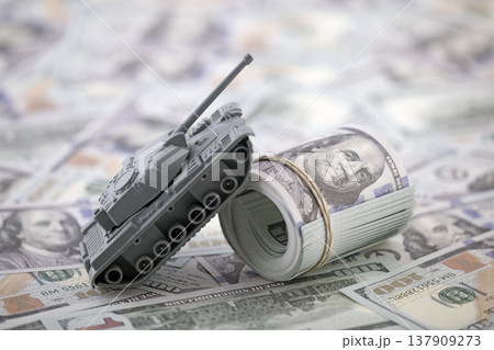 Tank on hundred dollar bills banknotes. Concept of war funding and military support