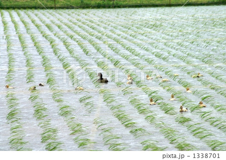 合鴨農法で減農薬栽培される稲苗と合鴨