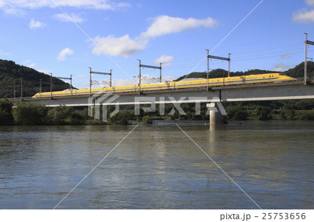 吉井川橋梁を行く黄色い新幹線ドクターイエロー