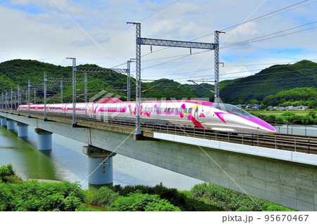 吉井川を渡る山陽新幹線100系こだま号:フレッシュグリーン編成