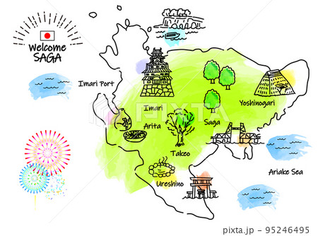 手描きの佐賀県の観光地のシンプル線画イラストマップ