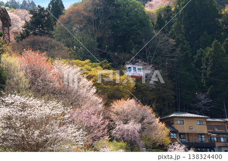 世界遺産 吉野山の満開の桜とケーブル