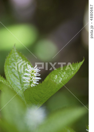 若葉に守られたヒトリシズカの白い花穂(蕊)【野草】長野県・5月