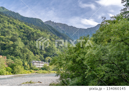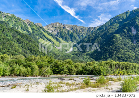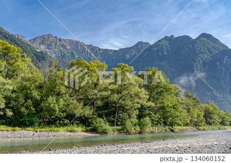 長野県上高地の小梨平キャンプ場から見る梓川と穂高連峰