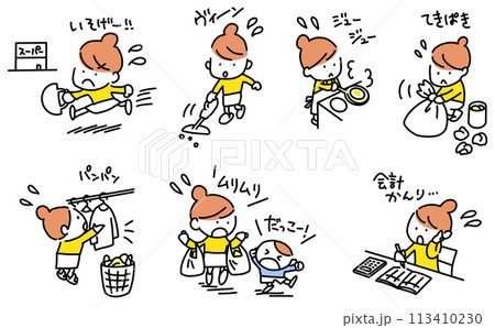 様々な家事を頑張る女性のセット 手描きイラスト