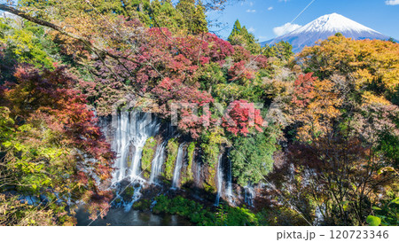 「静岡県」展望台から望む紅葉した白糸の滝と富士山