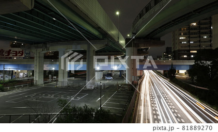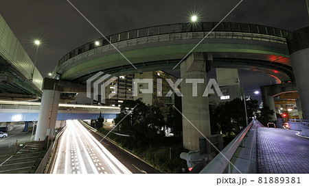 名古屋第二環状自動車道本線と支線を接続する名古屋市の上社ジャンクションの夜景と、車の光跡