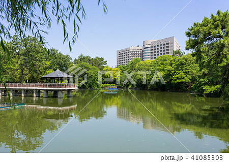 名古屋市昭和区都市風景 鶴舞公園 竜ヶ池と名古屋大学病院