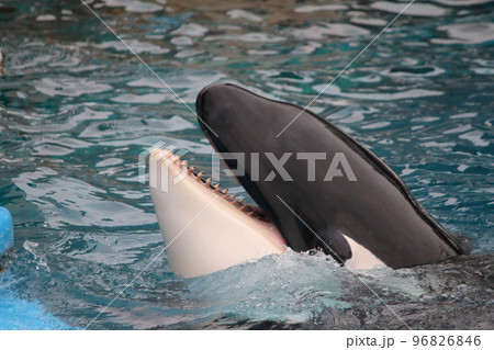 水族館の飼育員から餌をもらうために口を開けるシャチ