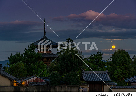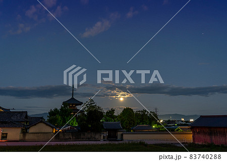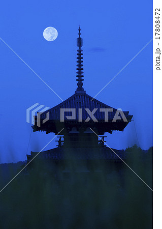 奈良県斑鳩町 世界遺産法起寺の三重塔の向こうから上ってくる中秋の名月