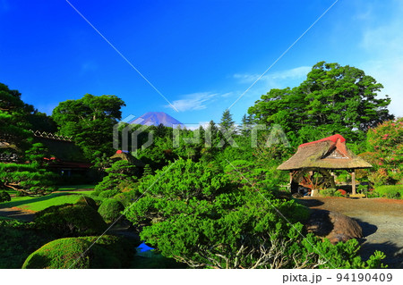 忍野八海から望む春の忍野の街並みと忍野八月の風景(山梨県)