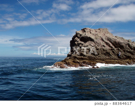 晴天紺碧の海、南伊豆沖磯「石取根」の「田牛向かい」「表本場」の釣り座を海上より撮影。