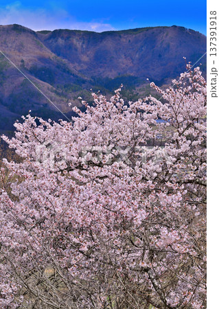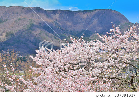 名胡桃城址からの眺め 満開の桜 集落と三峰山 群馬県みなかみ町