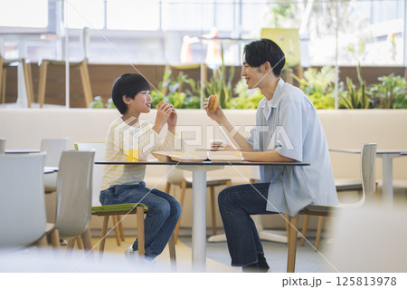フードコードで食事をする親子 9歳の男の子と30代の父親
