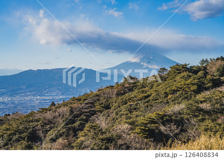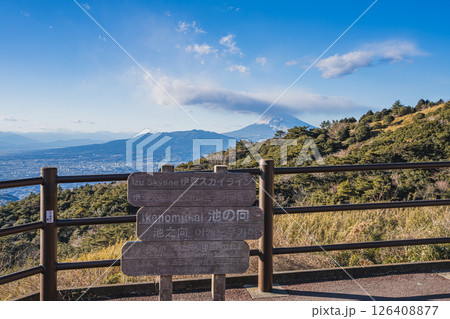伊豆の国市にある池の向駐車場から見た富士山と街並み(静岡県)