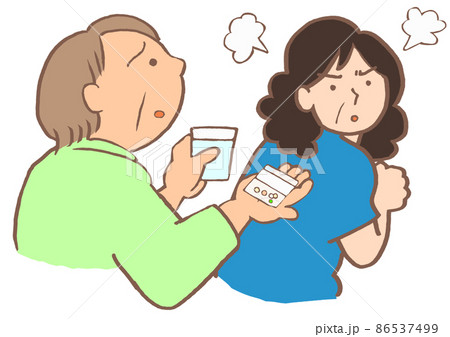 内服をすすめる家族と拒薬する統合失調症の女性のイラスト