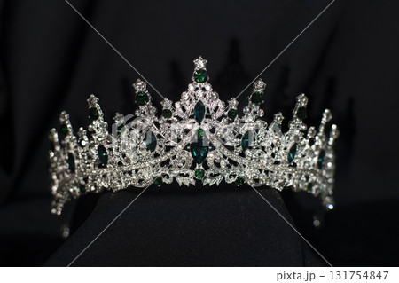 Crown with emerald green gemstones on black background. Jewelry