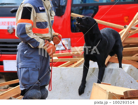 黒い毛並みの救助犬と、ハンドラー(防災訓練会場にて撮影)