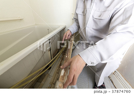 ヘルメットの作業員 住宅系汎用素材 ユニットバス取り替え前の内部点検