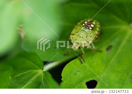 葉の裏に隠れる背中の水玉模様が鮮やかなカメムシ