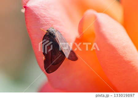 花びらにとまるチュウゴクアミガサハゴロモ