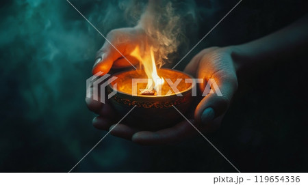 Close up of a traditional fire cupping therapy session with glass cups placed on a patients back and therapist using fire to create suction, promoting relaxation and healing.